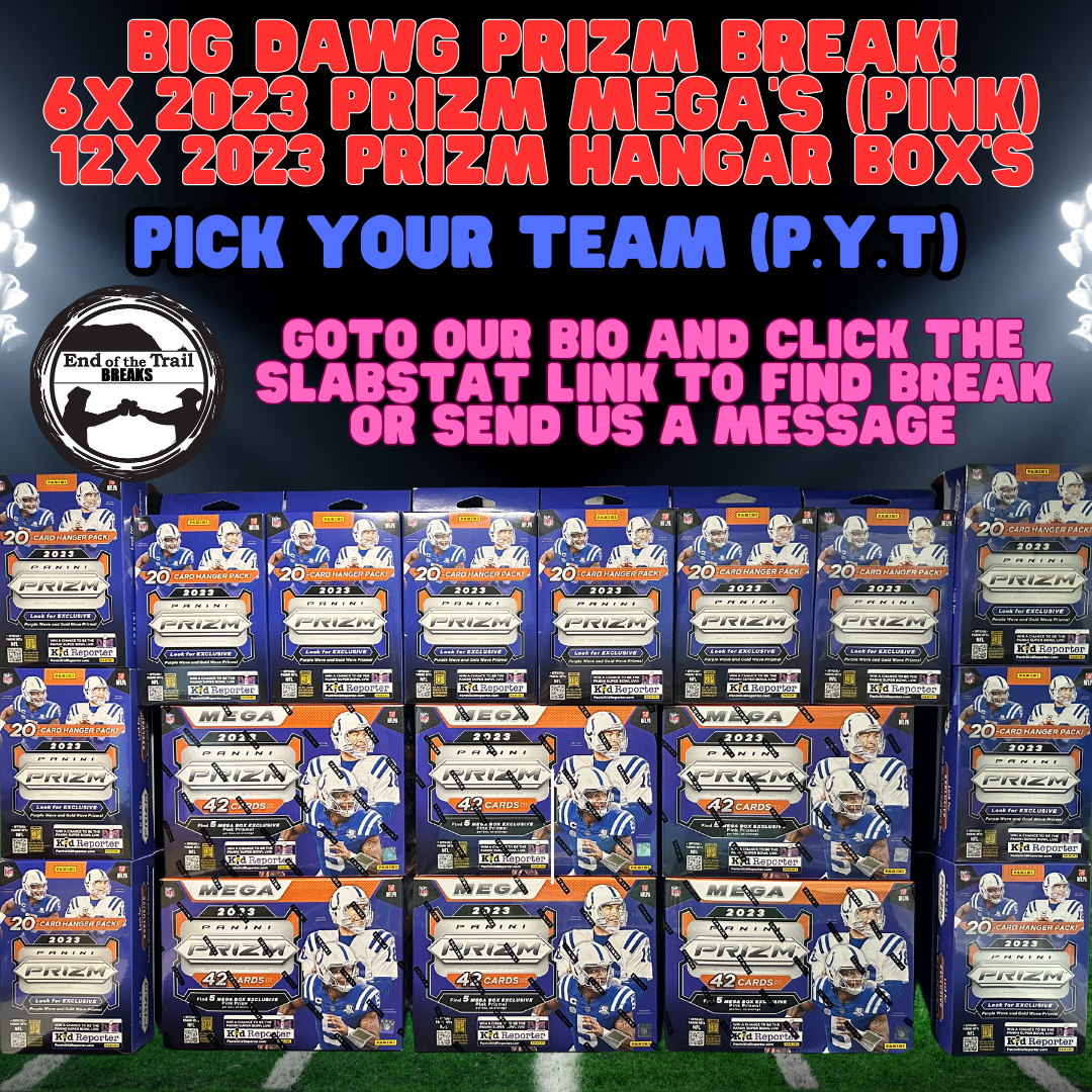 6x 2023 Prizm Mega Boxโs (Pink) and 12x 2023 Prizm Hangar Boxโs (Purple & Gold Wave) for a total of 18 boxโs. Each MEGA Box has 5x Mega Exclusive Pink Prizmโs, 1 Mem Card and 3 Silver Prizms. That totals out to 30x Pink Prizms, 6 Mem Cards and 18 Silver Prizms. The Hangar boxโs have a chance at numbered cards as low as /10!!